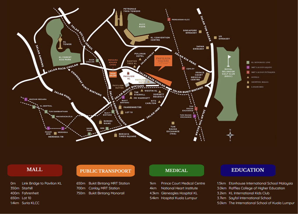 Walk to Pavilion Mall, Fahrenheit 88, and Lot 10. Minutes from KLCC, TRX, and major business districts. MRT and monorail stations are nearby. Everything you need is at your doorstep.